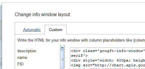 This page tells you how to add a Street View snapshot and there isn't really much to it. You just need to make sure you have an API console key (baffled? see this for how to get one) which is just a key code that you need to make it work. All you need to get one is a Google account. The other thing you'll need is two columns in your table specifying a latitude and longitude. I do this in ArcGIS before importing the data into Fusion Tables. Once you've done this you can add in the Street View code to the Fusion Tables info window layout (via Tools, Change info window layout... as below) and then add in the code via the Custom tab.