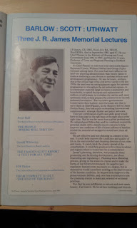 This in turn reminded me of the 1985 edition of the Planner magazine that I've had on my desk for some time. Why do I have this? Because it's a special issue to commemorate the life of former Chief Planner and University of Sheffield Professor JR James, who featured on the front cover of the April 1985 edition, five years after his untimely death in September 1980. In this edition, leading planners of the time gave a series of lectures on seminal reports - Peter Hall on The Barlow Report, Gerald Wibberley on The Scott Report and HR Parker on The Uthwatt Report.