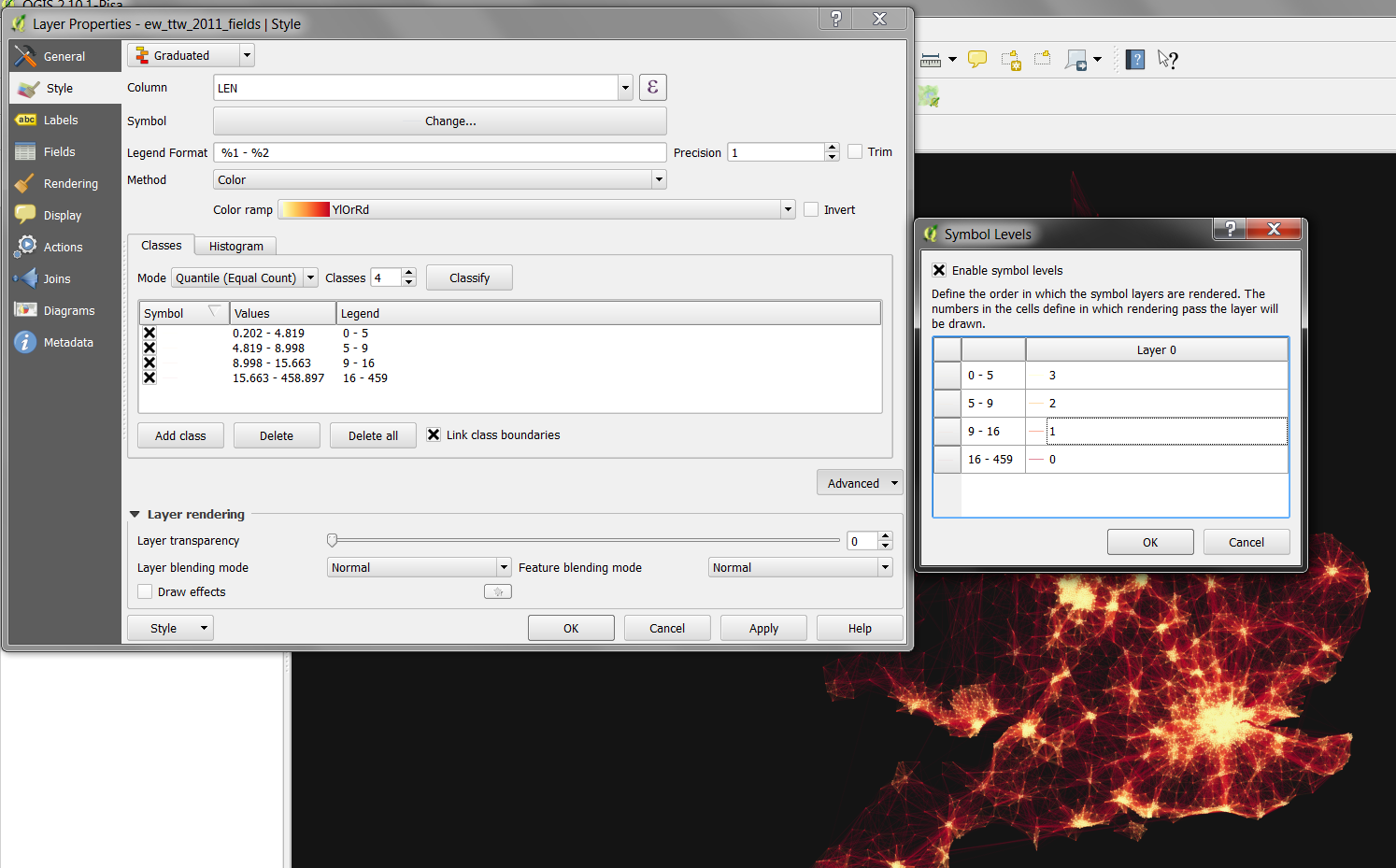 In one of my previous QGIS posts, on flow mapping, I outlined a method for mapping origin-destination data related to movements, rendered as a collection of straight lines from point a to b. One thing I didn't do in that post was explain how you get the 'glow' effect to make the lines appear brighter at higher densities (example below).