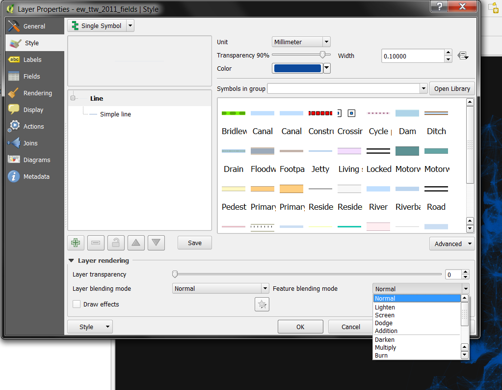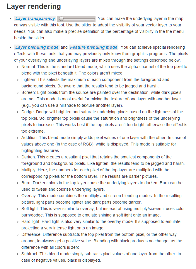 What on earth do all the different blending modes do? There's 'Screen', 'Multiply', 'Dodge' and many more but it's not immediately obvious so here's a little summary from the QGIS 2.8 documentation pages on the subject: