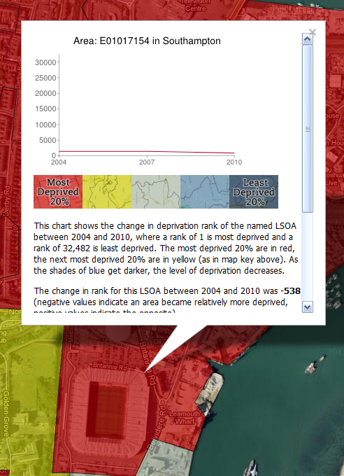 Quite a lot, and I wouldn't want anyone to think that I've done this to pick on any one team. I'm just curious about the relationship between these football grounds and underlying patterns of deprivation because when I look at the data as I map it, I often notice the stadia. It doesn't tell us anything about cause and effect, whether teams are trying to do anything to boost the fortunes of their local areas or what the areas themselves are like to live in. If you want to know more about the underlying data, read this briefing from the Government. Does having a Premier League football team in your area make you poor? Of course not.