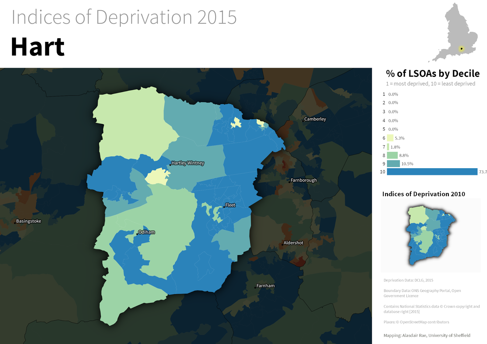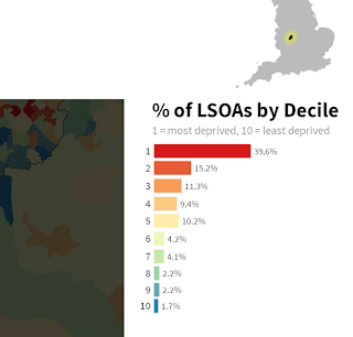 When I do a visual comparison of the Birmingham map, I'm surprised that the least deprived (i.e. richest) areas only account for 1.7% of the total, because I'm drawn to the blue of the choropleth. This could be solved though a cartogram approach, but I wanted to preserve geographical accuracy here. I'm not surprised that almost 40% of areas are in the poorest decile - that's what I'd expect from what I know about deprivation in English inner-cities. Let's look at another example below.