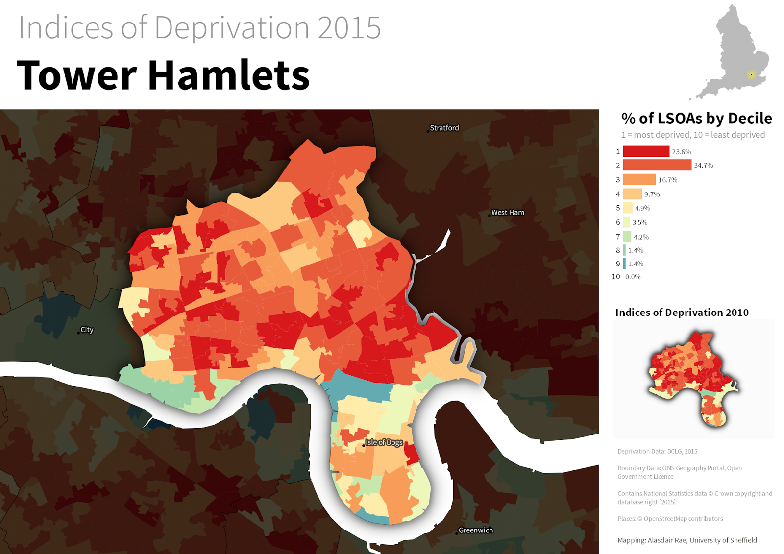 This time I've shown one of the poorest parts of London - Tower Hamlets. An interesting aside here is the emergence of one area in decile 9 (i.e. richer area) compared to the pattern from 2010. This is almost certainly linked to gentrification and displacement rather than individuals becoming 'less deprived'. I find the extra information provided in the bargend very useful analytically/cognitively compared to the simple legend we would normally use.