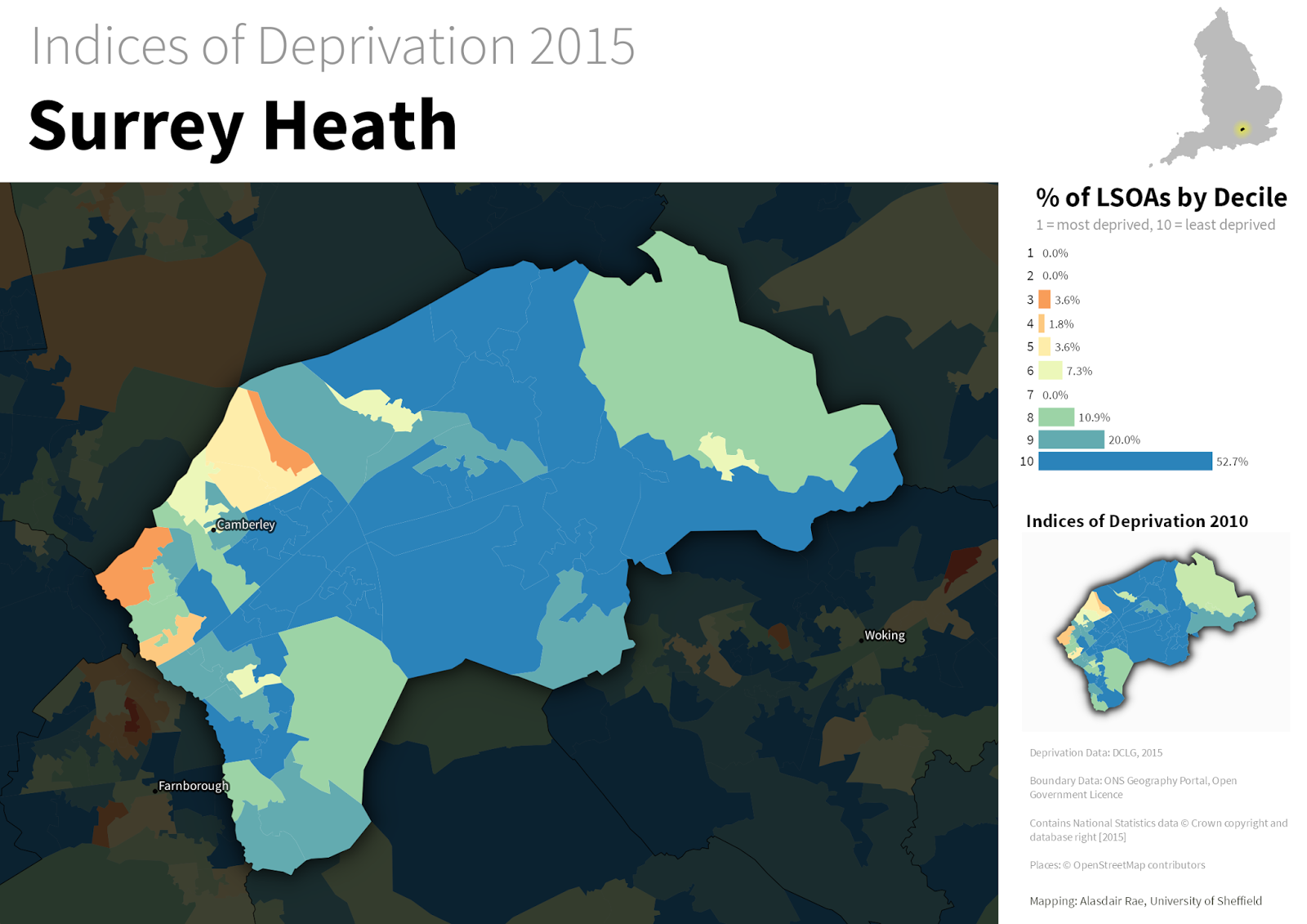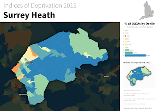 One of the benefits of this approach, in my view, is when you compare different places - you can click on an image above and then go forward and backward to make comparisons. The added value of the bargend approach means that you have precise details of the proportion of areas in each decile and you can make more meaningful comparisons. You could just do this with a table or chart and dispense with the map altogether, but then you'd lose the very important ability to identify where precisely individual areas are and where spatial concentrations of deprivation (and affluence) exist. Talking of affluence, it's only fair that I show you some maps of places that are at the opposite end of the scale. Two prime examples...
