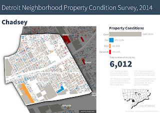 The 'neighbourhoods' I used are the 54 'Master Plan Neighborhoods' provided by Data Driven Detroit, and available here as open data. For each area I've shown the proportion of properties in each category, in addition to the total number of structures for each area. The image above shows the Mt. Olivet neighbourhood to the north of the city, whereas the map below shows Chadsey, to the south of the city. One of the points I wanted to make here is that although Detroit has its problems - well documented - it's not necessarily the burning relic that some portray it to be. Anyone looking for an insight into all of this would do well to listen to fifth generation Detroiter George Galster's Driving Detroit lecture (which he also gave here in Sheffield last year).