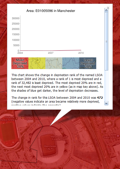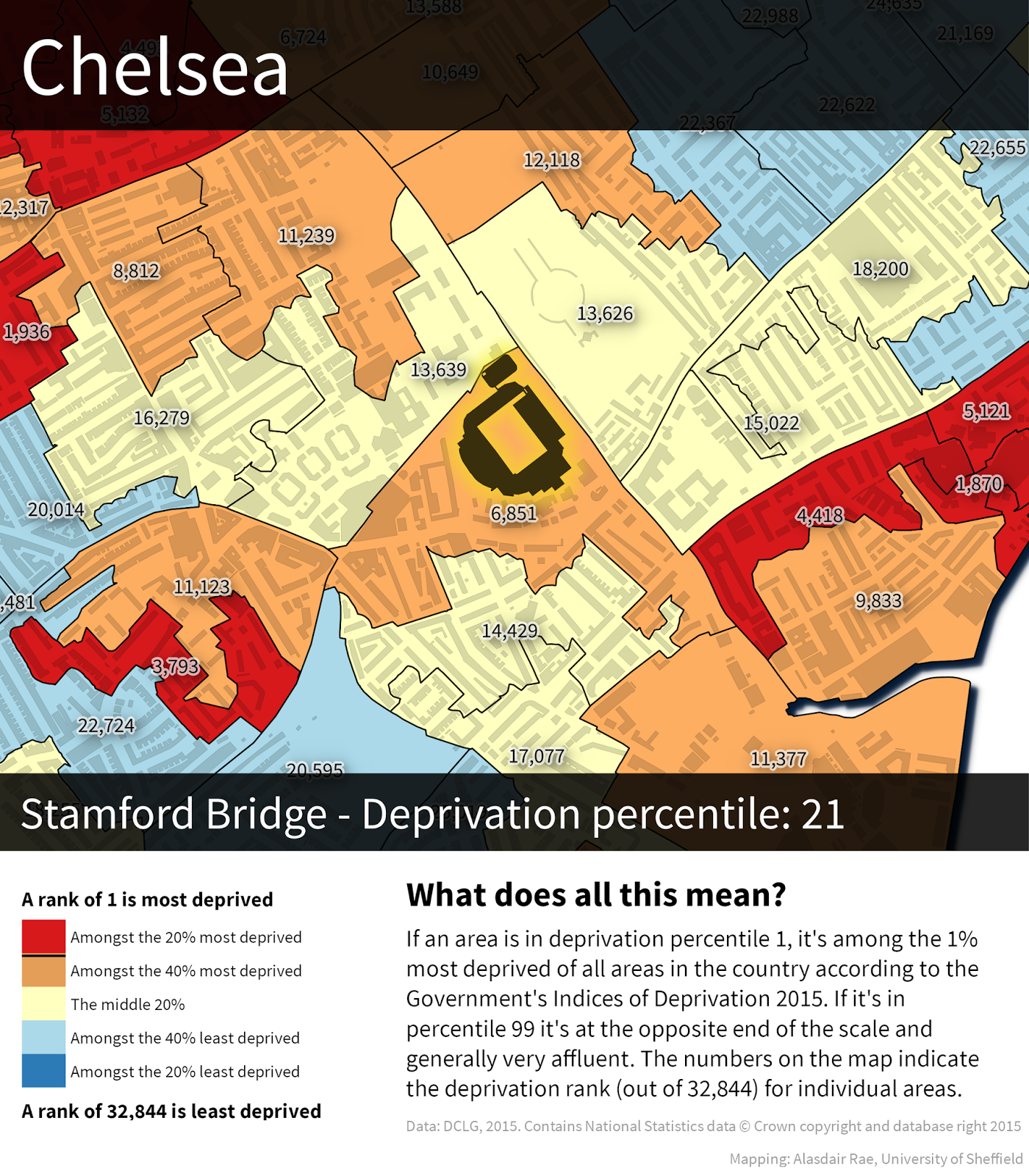 The financial health of the English Premier League is a regular topic of discussion. No matter how you look at it, the sums of money involved in the operation of Premier League teams are immense and it looks even more striking when you consider the locations of their stadia - typically in the most deprived areas of England. This is related to a number of factors (e.g. history, land values), but in my work on neighbourhood deprivation and mapping I've noticed a common trend over the years so I decided to look at the location of all 20 current Premier League teams in England and how deprived their local area is, using the Government's official measure of deprivation (the IMD*). The maps below show each team and its area's deprivation rank within England, where 1 = most deprived and 32,482 = least deprived. Shading: red = poorest 20% of areas in England, yellow = next poorest 20%, and so on... Liverpool is most deprived and Fulham least. See below for more.