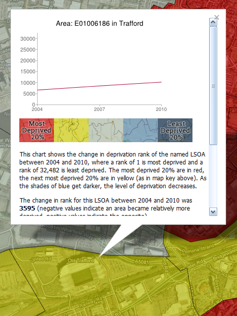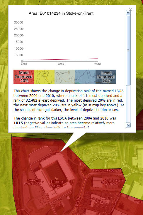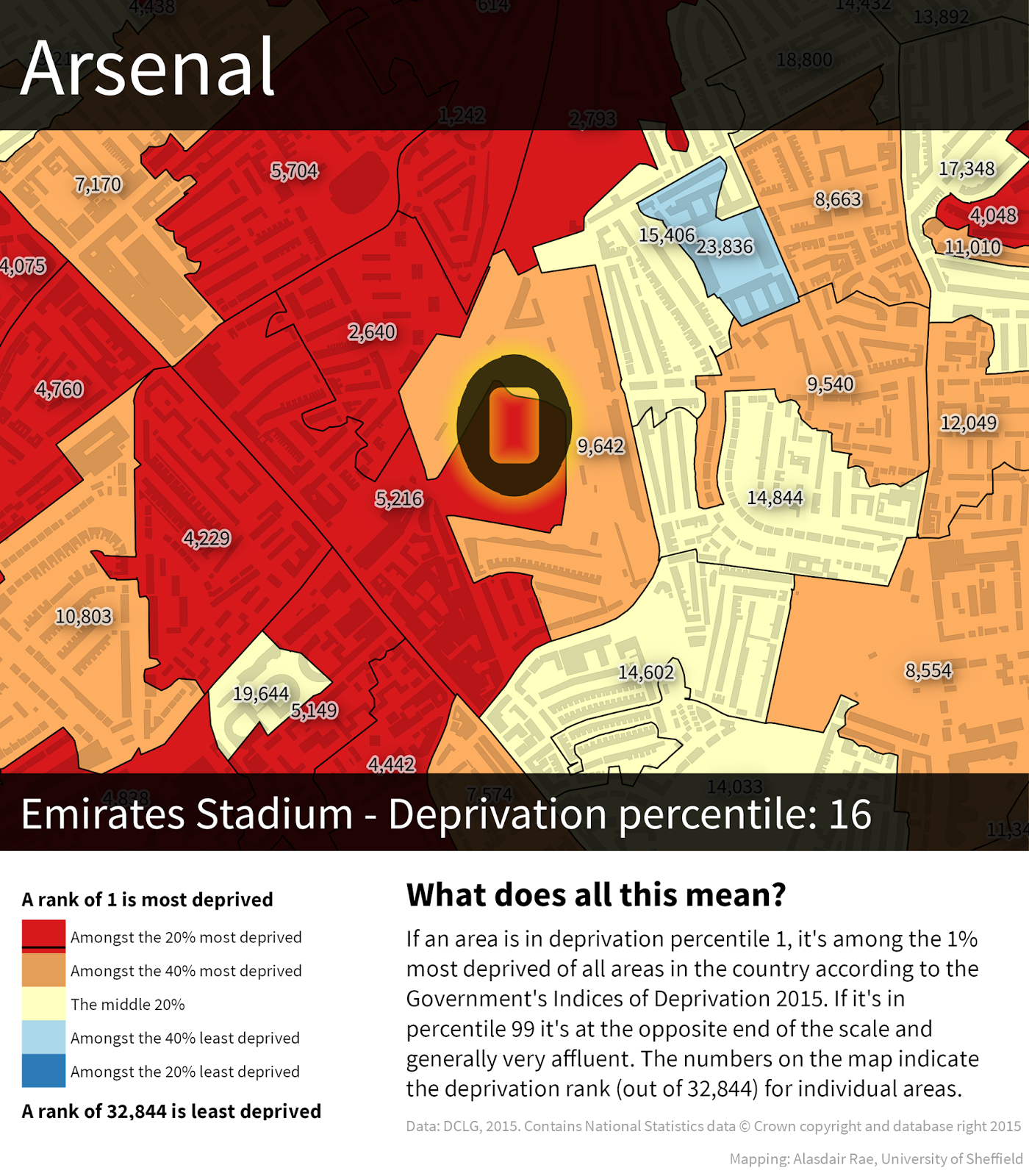 The financial health of the English Premier League is a regular topic of discussion. No matter how you look at it, the sums of money involved in the operation of Premier League teams are immense and it looks even more striking when you consider the locations of their stadia - typically in the most deprived areas of England. This is related to a number of factors (e.g. history, land values), but in my work on neighbourhood deprivation and mapping I've noticed a common trend over the years so I decided to look at the location of all 20 current Premier League teams in England and how deprived their local area is, using the Government's official measure of deprivation (the IMD*). The maps below show each team and its area's deprivation rank within England, where 1 = most deprived and 32,482 = least deprived. Shading: red = poorest 20% of areas in England, yellow = next poorest 20%, and so on... Liverpool is most deprived and Fulham least. See below for more.