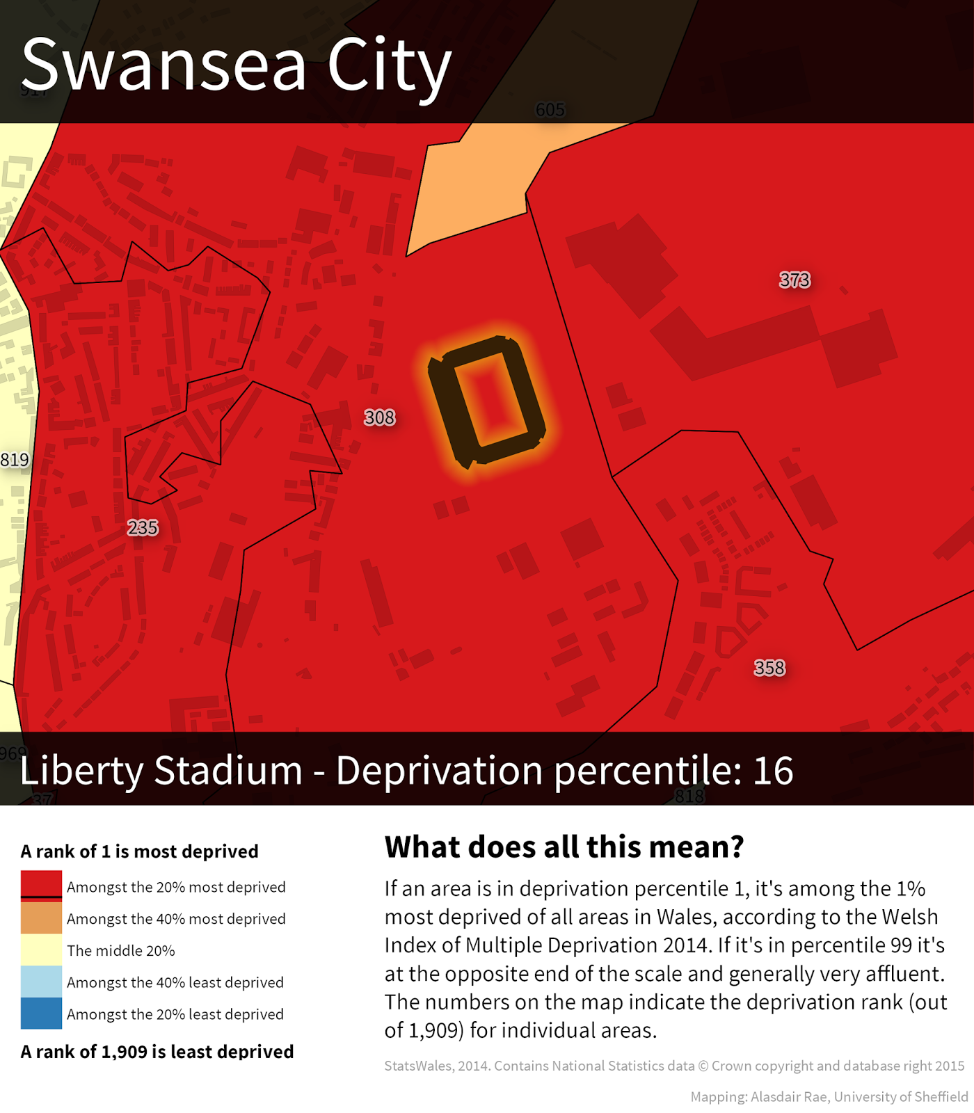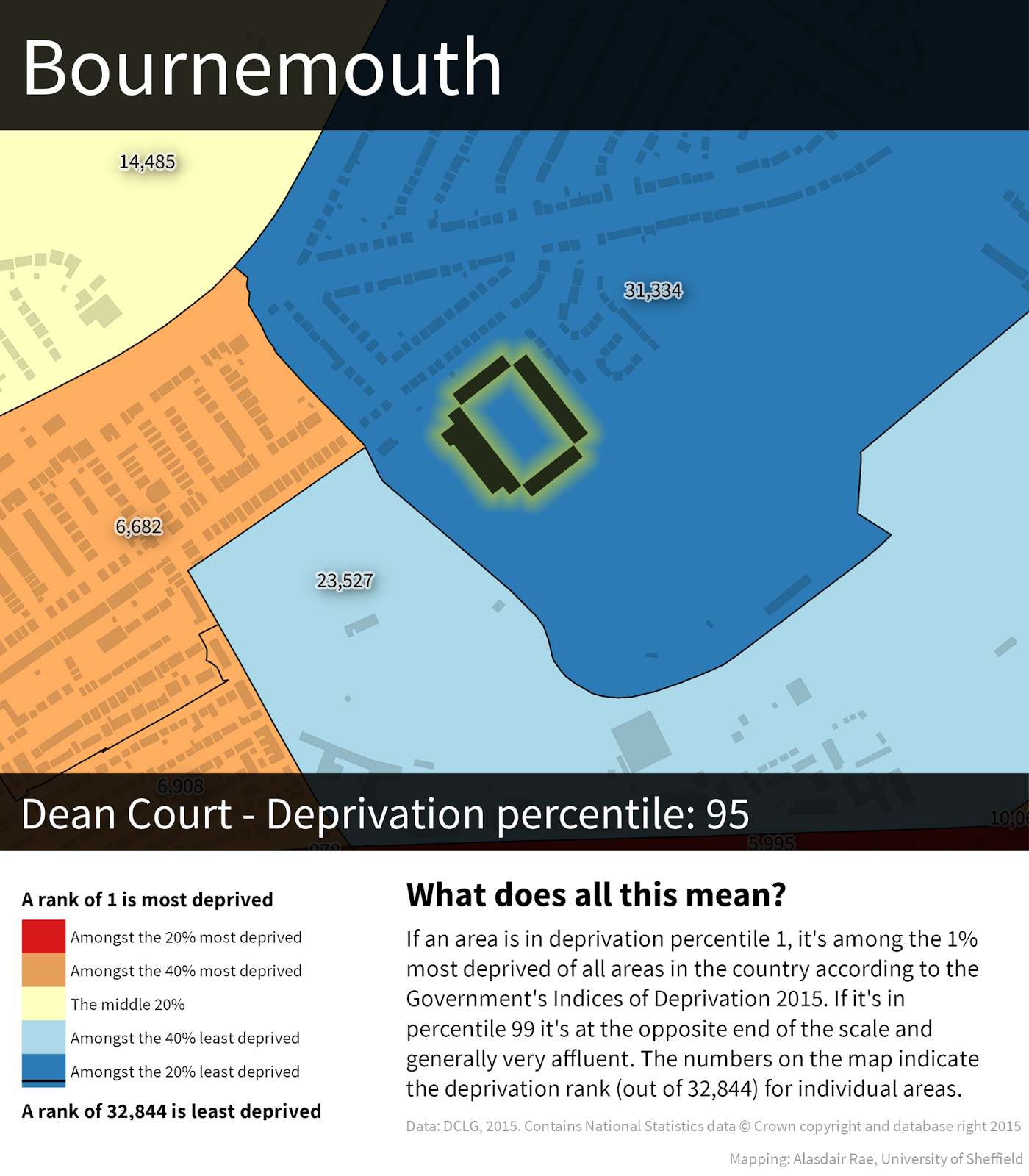 In England, there are 32,844 areas known as Lower Super Output Areas. These LSOAs are small areas which the government use to report all kinds of statistics, including Census data. When they publish their Indices of Deprivation, they give each one of the 32,844 areas a rank, from 1 (most deprived in England) to 32,844 (least deprived in England). Therefore, it's a relative measure that allows us to compare one area with another, all across the country. The data are often split into five or ten chunks (quintiles or deciles) for reporting purposes but here I've decided to use 'percentiles' as it's more precise. If an area is in percentile 5, it's among the 5% most deprived in England, and so on. If it's in percentile 95 (like Bournemouth's ground) then we can say it's not very deprived at all and actually highly likely to be a very affluent area. In the case of Swansea City, I've used Welsh deprivation data from 2014. This classifies places in almost exactly the same way, although there are 1,909 areas in Wales rather than 32,844. These areas have an average population of around 1,600.