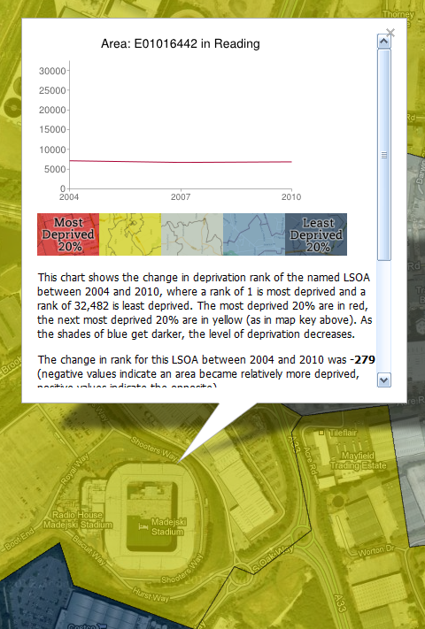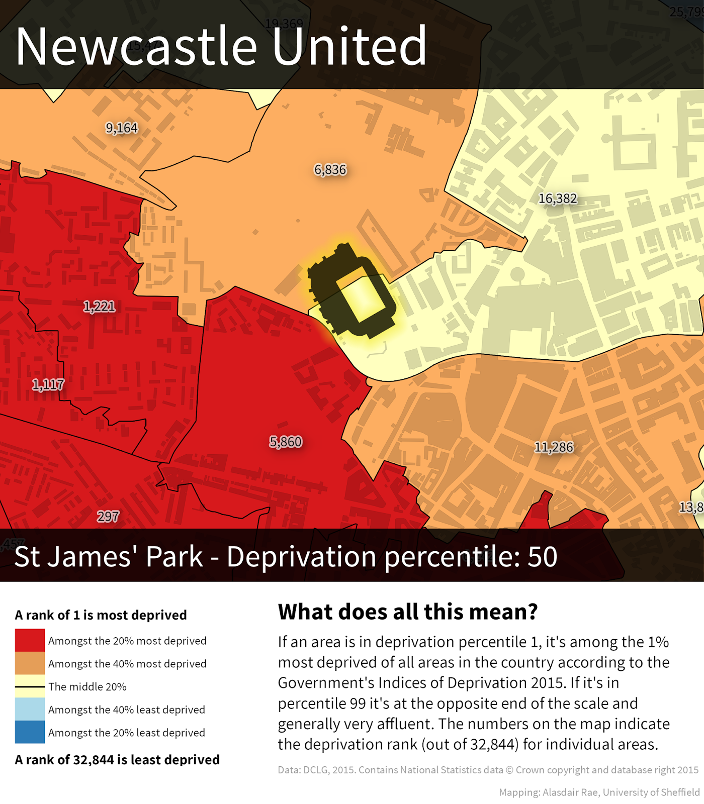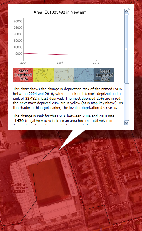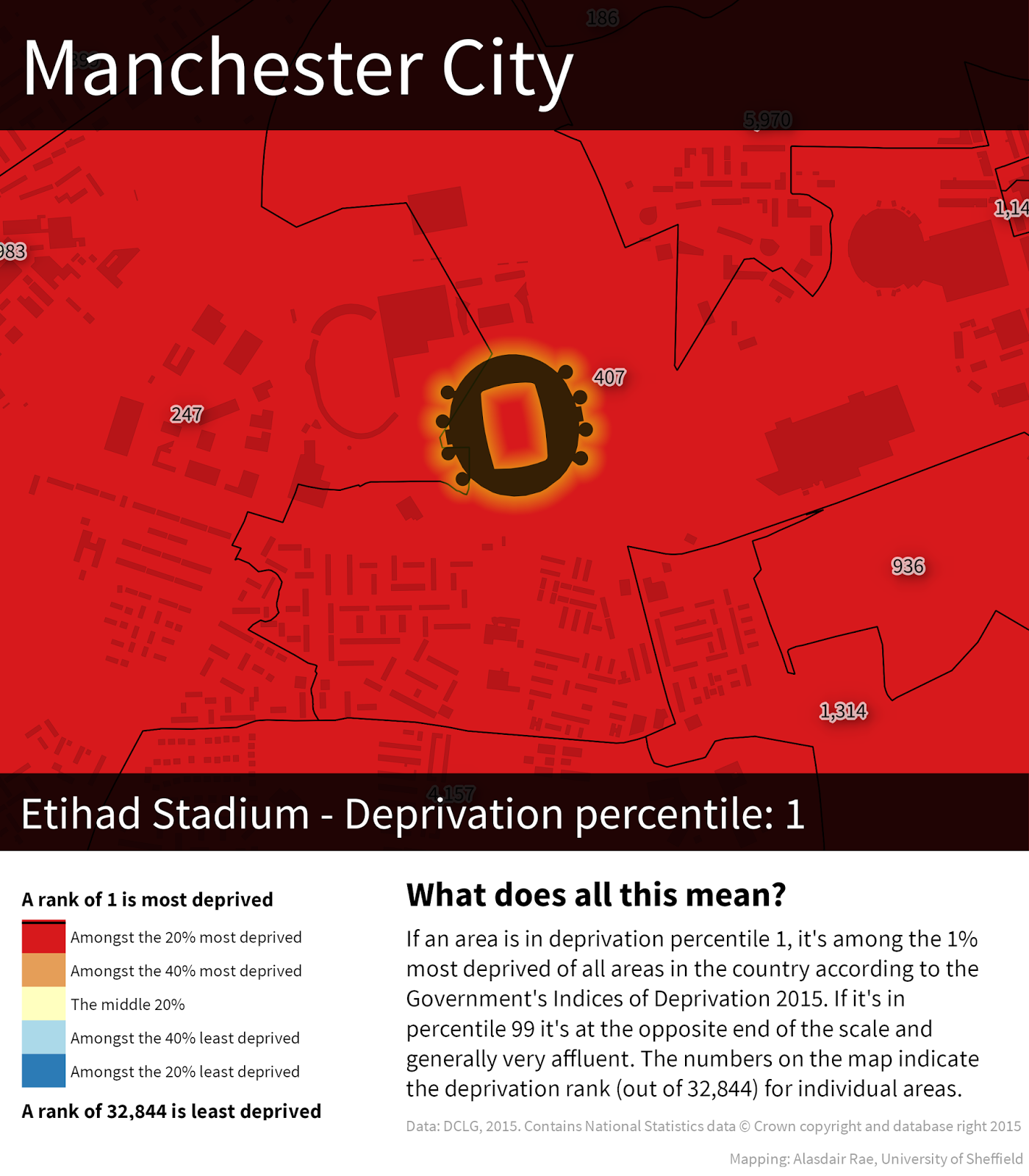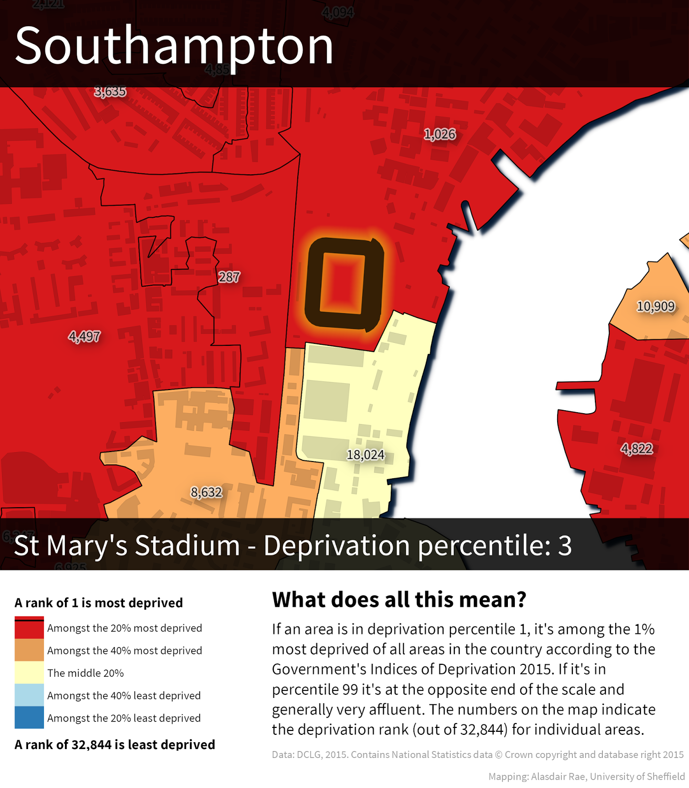 Quite a lot, and I wouldn't want anyone to think that I've done this to pick on any one team. I'm just curious about the relationship between these football grounds and underlying patterns of deprivation because when I look at the data as I map it, I often notice the stadia. It doesn't tell us anything about cause and effect, whether teams are trying to do anything to boost the fortunes of their local areas or what the areas themselves are like to live in. If you want to know more about the underlying data, read this briefing from the Government. Does having a Premier League football team in your area make you poor? Of course not.